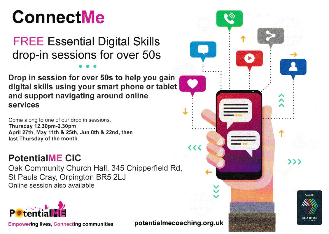 Potential Me run drop in sessions for over 50s to help you gain digital skills using smart phones or tablets on the last Thursday of each month, between 12.30-2.30pm.